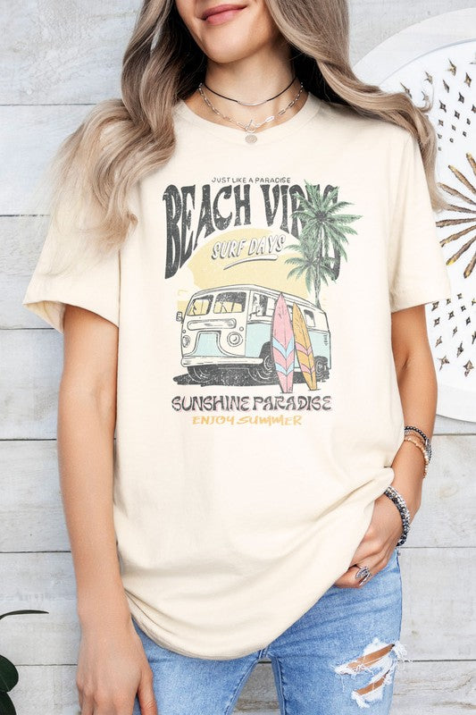 Retro Beach vibes t-shirts. Summer, good vibes. Relax, chair hand sketch. Paradise t-shirt graphics design, typography slogan on palm trees background. Aloha Hawaii. Beach bus. Graphic Tee