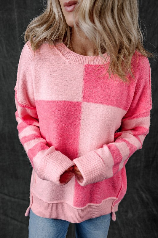 The soft pink hue is complemented by striking color block and striped details, adding a touch of sophistication to your outfit.