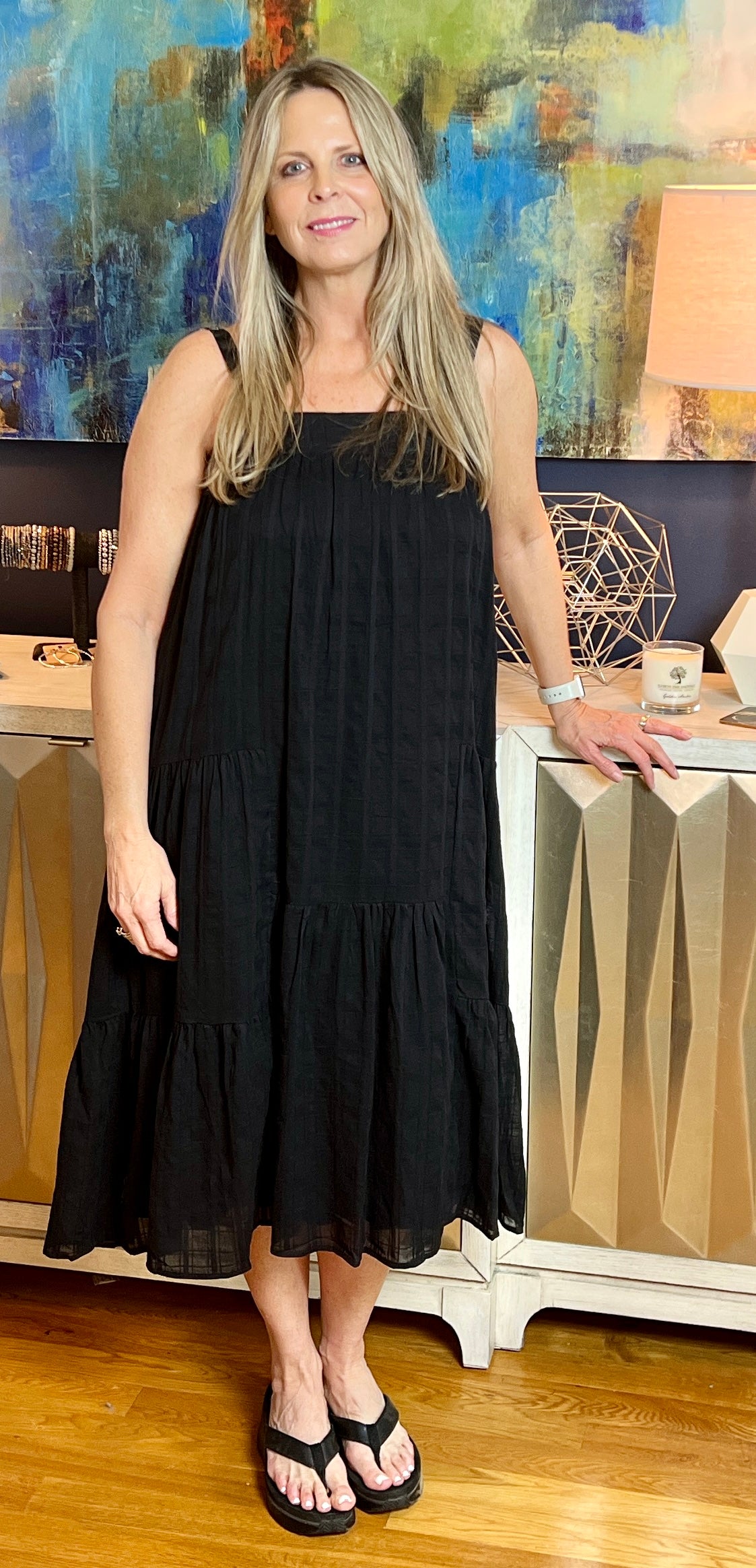 Sleeveless midi dress featuring a tiered design and adjustable straps.
