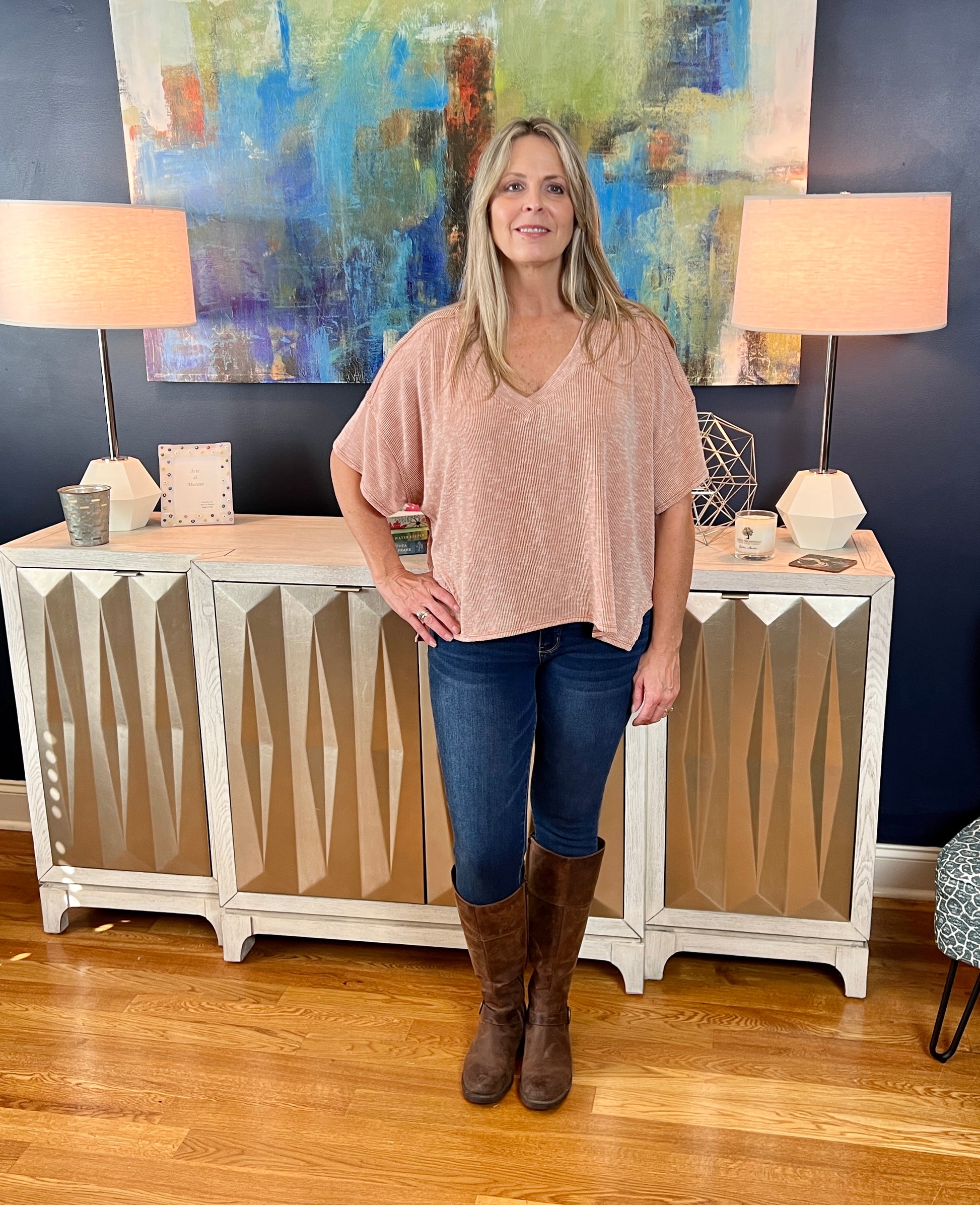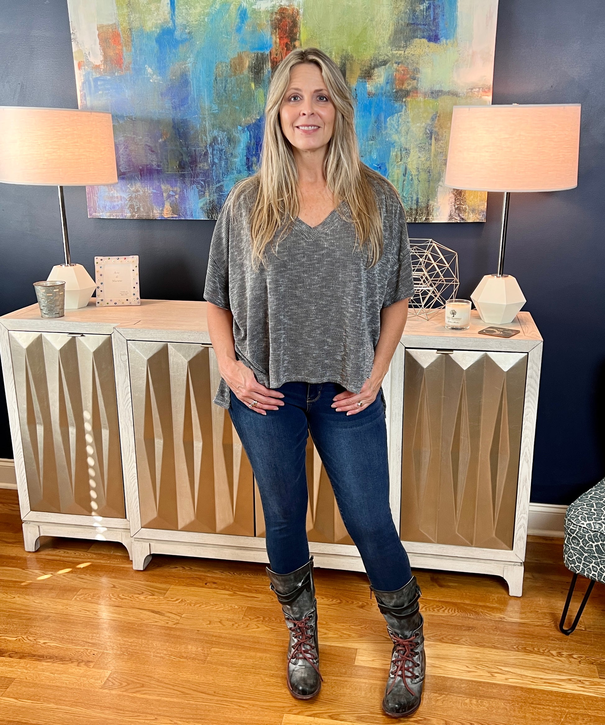 Loose fit top, stretch ribbed fabric loose fit with a v-neckline & Hi-lo hem line