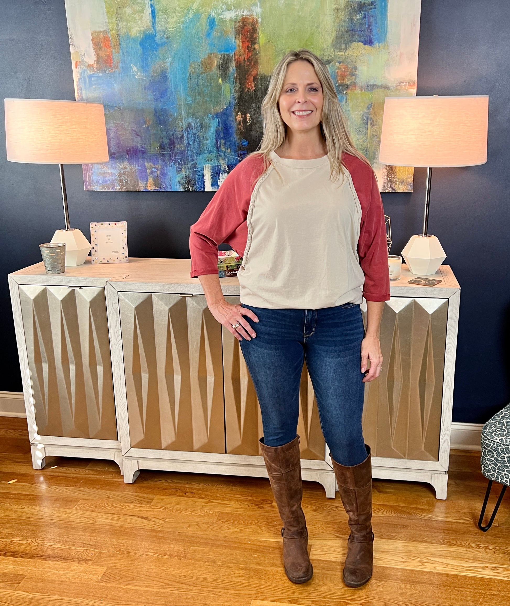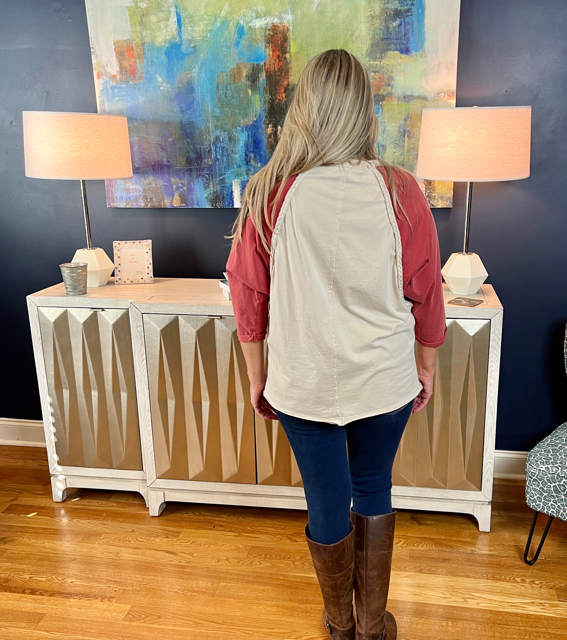 Baseball t-shirt with braided accents. Perfect for fall, winter, & spring with jeans, skorts or shorts. Washed Oatmeal & Red - 100% cotton