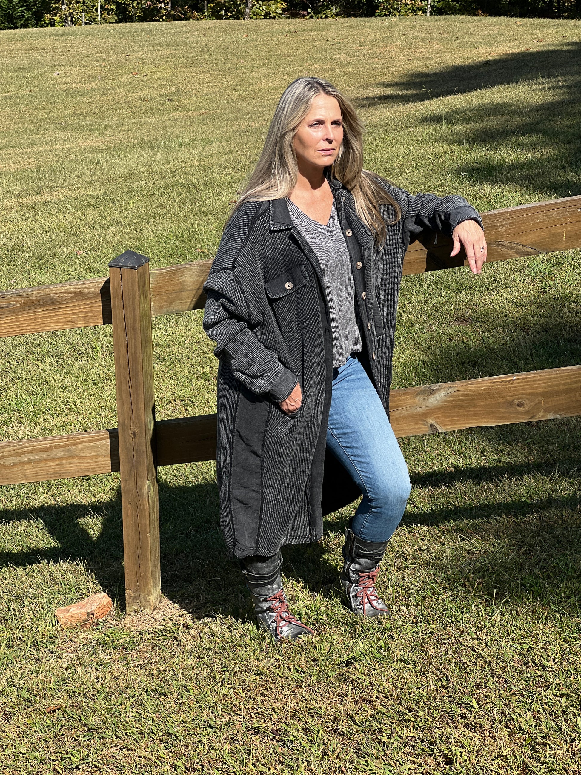 Washed Black Waffle Thermal Knit, 100% Cotton Oversized long blazer