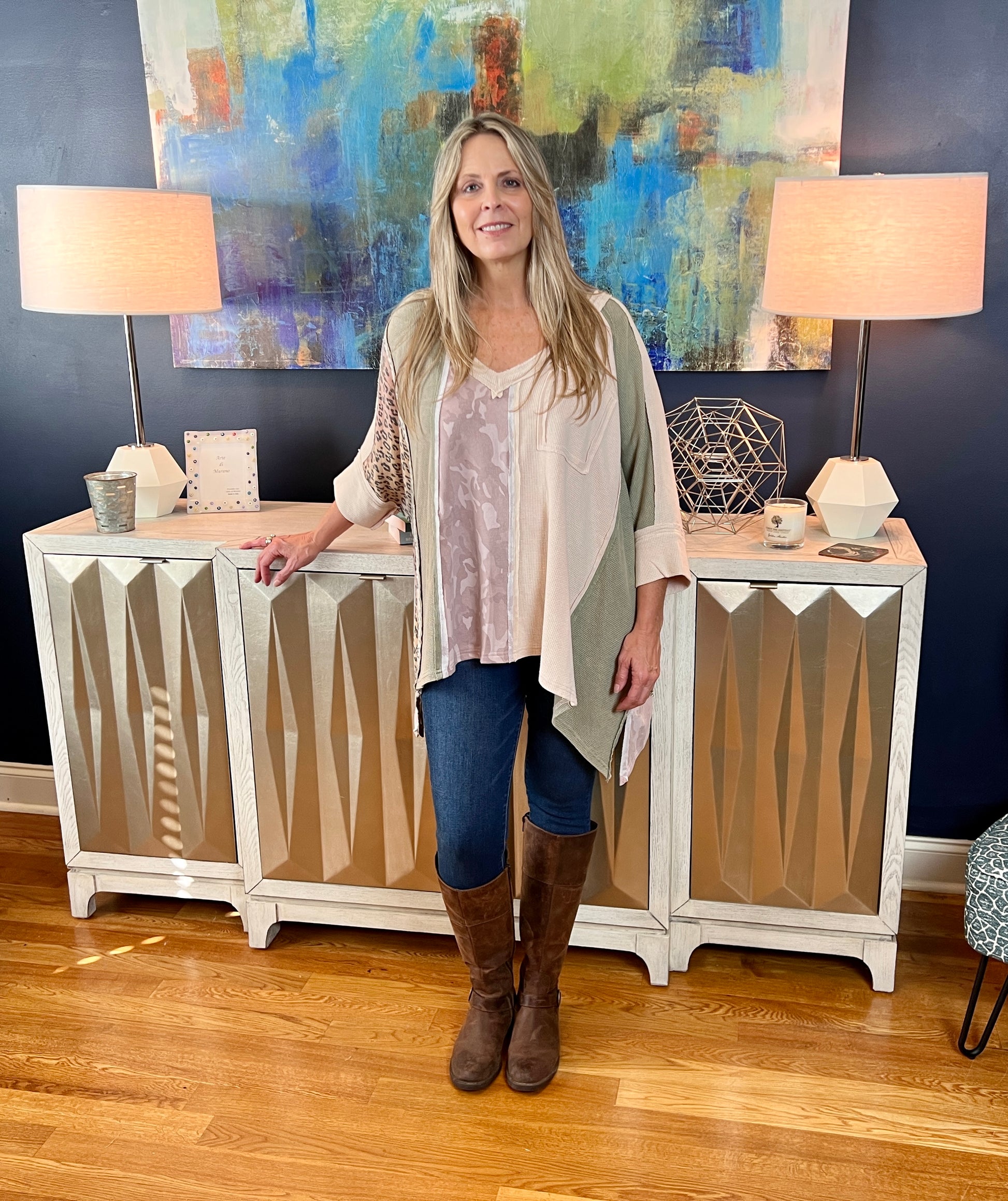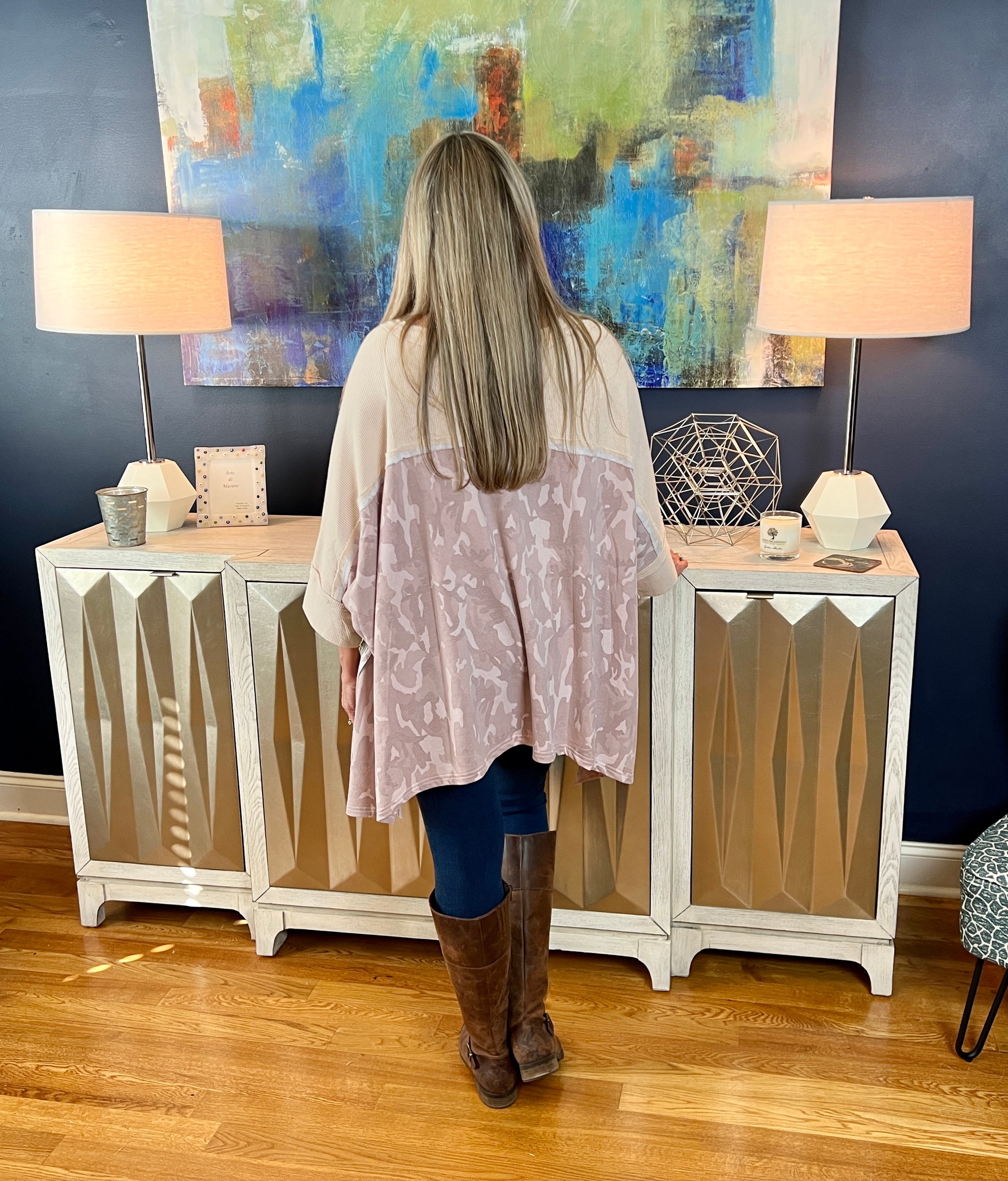 Oversized top with v-neckline. Sage, rose & camo. 75% cotton, 25% poly